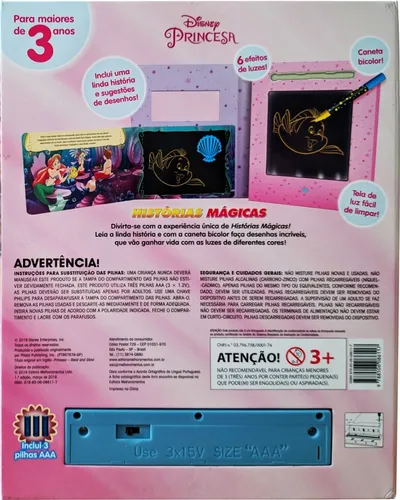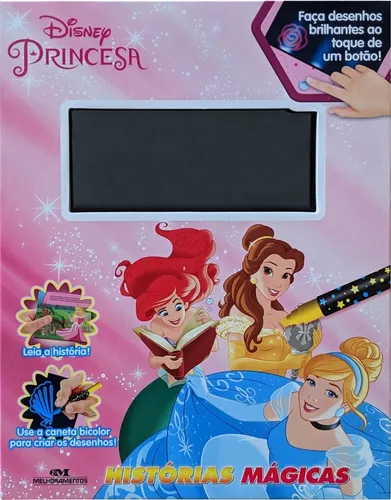 Divirta-se com a experiência única de Histórias Mágicas! Leia a linda história e com a caneta bicolor faça desenhos incríveis, que vão ganhar vida com as luzes de diferentes cores! Título do livro: Princesas Autor: Disney Idioma: Português Formato: Livro capa dura (hardcover) ISBN: 978-85-06-08611-7 Quantidade de Páginas: 16